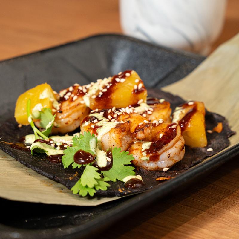 Shrimp, house-made gochujang and lime sauce, grilled coconut pineapple, sesame seeds, cilantro stem.